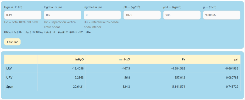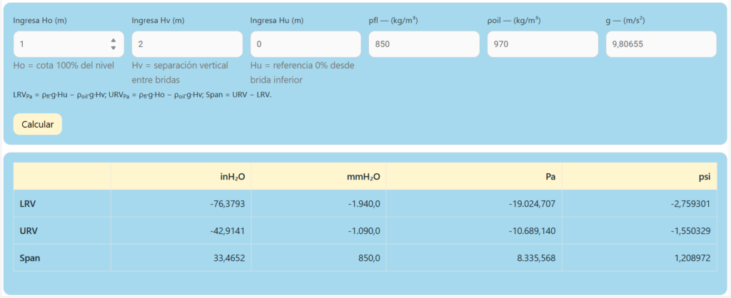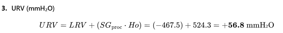 - URV (100 %): URVPa = pfl⋅g⋅Ho − poil⋅g⋅Hv