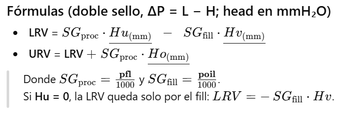 - LRV (0 %): LRVPa = pfl⋅g⋅Hu − poil⋅g⋅Hv