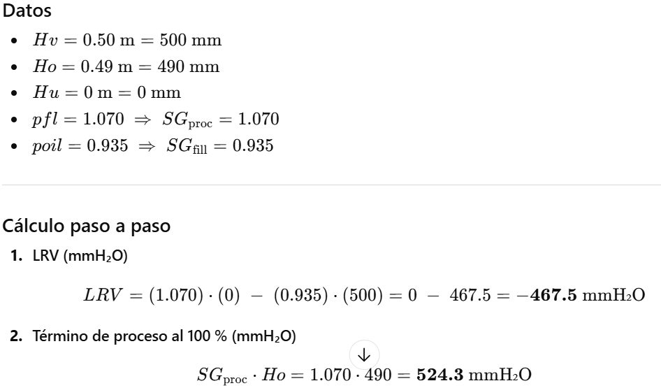 Equivalente en mmH₂O: LRVmmH2O= -19024,707/9,80665 = -1940,72 mmH2O